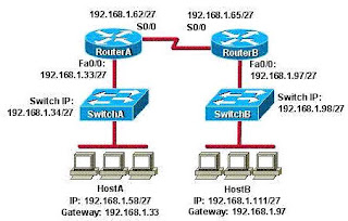 Sebuah sekolah memiliki jaringan dengan 2 lab komputer yang berbeda. Untuk menghubungkan antar lab, digunakan dua router yang terkoneksi melalui serial link. Masing-masing lab memiliki subnet sendiri agar lalu lintas broadcast tidak bercampur. Subnetting yang digunakan adalah /27 (255.255.255.224), yang berarti setiap subnet hanya bisa menampung 30 host.