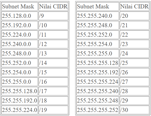 hapalin aja ini tablenya subnetmaksnya hehe: